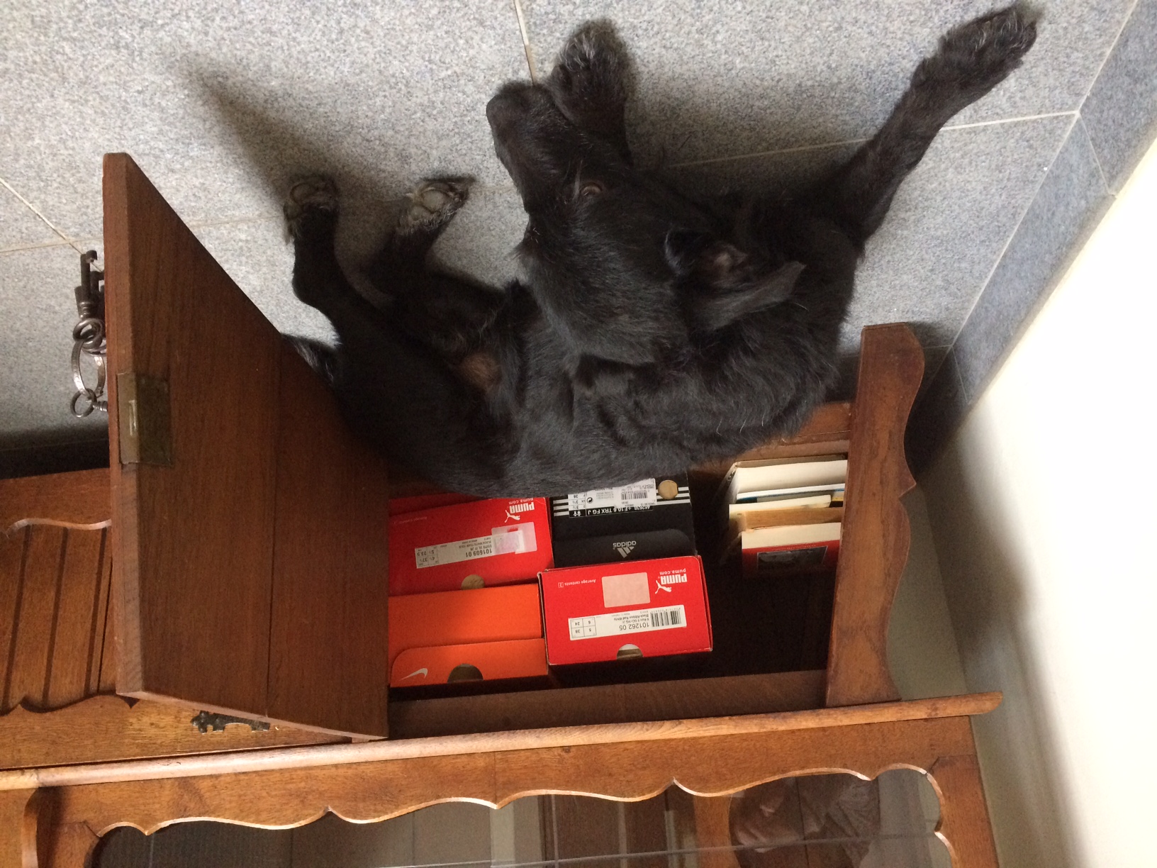 Ik heb hem in september 2016 uit Friesland opgehaald. Eerst stond het meubel in de gang, met de glazen kant naar de muur gericht. Precies zoals het rechtstreeks uit de auto werd neergezet. In quarantaine, acclimatiseren.